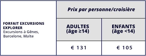 **Les forfaits Exlorer sont disponibles sur une sélection de destinations (Méditerranée, Europe du Nord, MSC Grands Voyages, Amérique du Sud. Pour plus d'informations sur les forfaits Explorer, rendez-vous sur www.msccroisieres.fr, rubrique Services à bord.